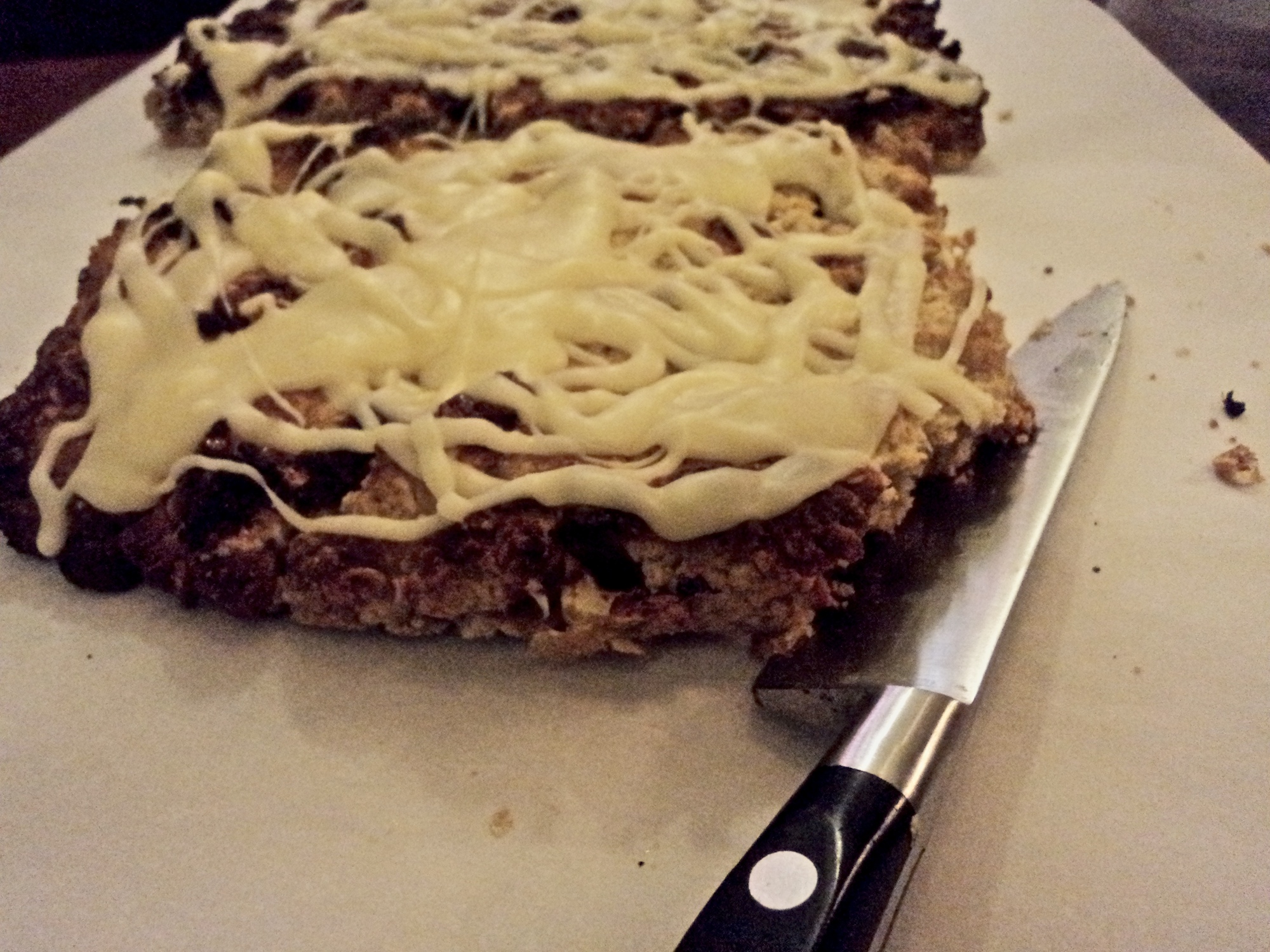 When the oat bars are cooled, drizzle over the white chocolate. Allow it to firm up, and then cut into bars.