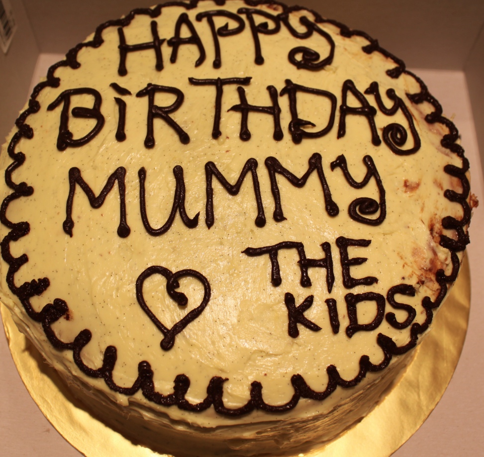 You also need a lot of time. This cake takes seven bakings of 10 minutes each, and we only used two cake pans – so there was quite a bit of washing, cleaning, and cooling in between. We iced the cake with a vanilla bean cream cheese icing and AngelKitten made a chocolate ganache to pipe the decoration and birthday wishes. Yangie (AngelKitten’s Mum) had been wanting a rainbow on her cake, and when she received a pure white iced cake, kept asking, where is my rainbow? When she cut into the cake, and found this gorgeous rainbow, she was thrilled. And I was delighted with being able to help AngelKitten create such a wonderful gift for her beloved Mum.
