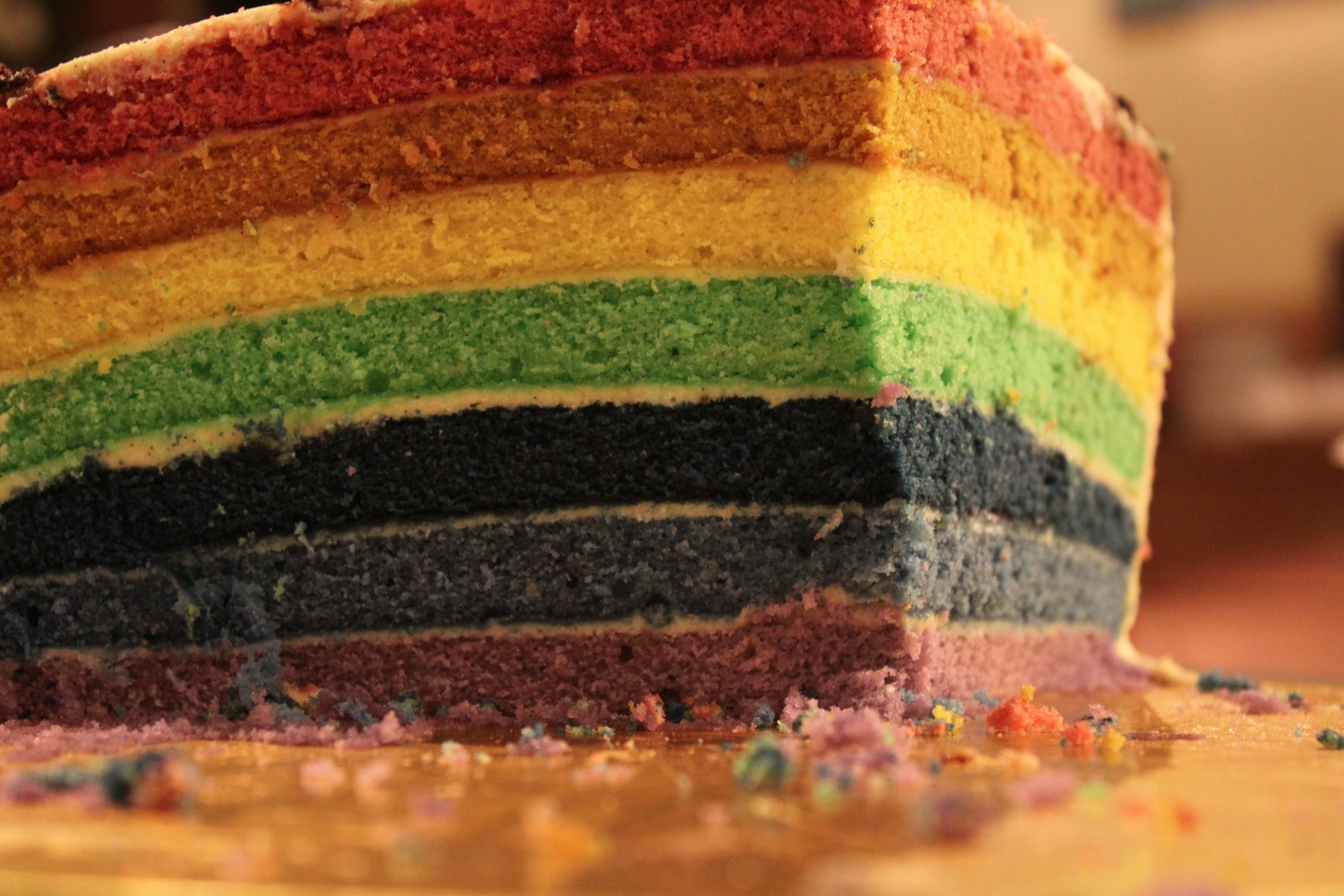 Divide the batter evenly into the seven bowls. Begin dying the batter, starting with the violet/purple hue. As soon as it is dyed to your liking (and remember it does get a little darker in the oven), pour the batter into a prepared baking tin, and smooth with a spatula. The layer will be very thin. Bake for ten minutes, or until a toothpick inserted into the cake comes out clean, and it springs back lightly when pressed. Remove the layer from the oven, cool on a cake rack for about ten minutes, and then remove from cake tin by turning onto cake rack. Keep the parchment paper on the bottom of the cake as it cools. Repeat with the remaining six layers, prepping your pans as you go.