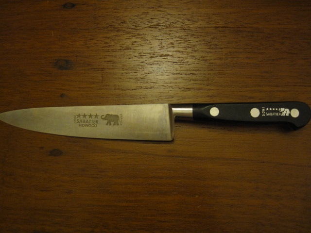 I collect chef’s knives. I love the different types of knives and different brands – I read about the different approaches to shaping and creating a knife with respect to the art form that this truly is. When I finally had the money and the desire to start collecting my own knives, there was only one knife I wanted – a Sabatier. These knives are handmade in Thiers, France from a single piece of high carbon stainless steel. The blade and handle are a single piece of steel, so there is no risk of a blade divorcing a handle mid chop! The knives are hand forged, and have an unbelievable balance in the hand, and a wonderful almost instinctive slice. Their sharpness stays for ages, and they feel both delicate and strong in the hand. I love these knives, and this one, my 4 star elephant Sabatier is my absolute favourite. Its a bit larger than a paring knife, but not as huge as a big chef’s knife. Its large enough to tackle big jobs, sharp and sturdy enough to mince an onion in a few seconds, and comfortable enough in my hand so that I never ever feel tired when using it.