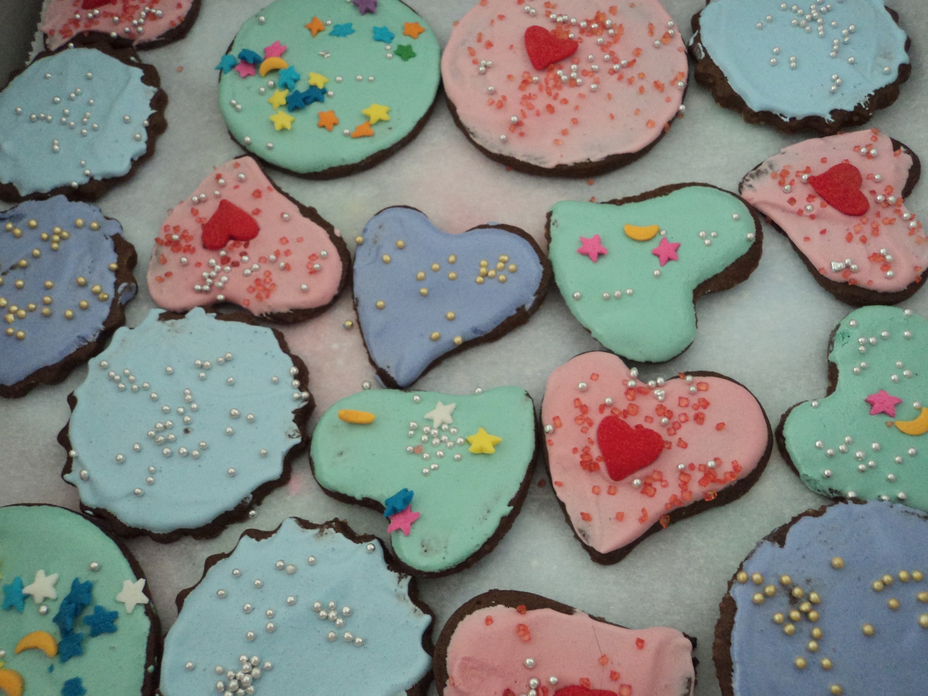 I used Royal Icing for the cookies, and it set hard, and gorgeous. And because it was a children’s party, I used IndiaTree natural food colours – they were the loveliest shades of pastel – pink, robin’s egg blue, violet and spring green. Before the icing set, I decorated them with tiny silver and gold dragees, hearts, sparkle sugar, and colourful hard sugar confetti. They looked luscious, and they tasted pretty great too!