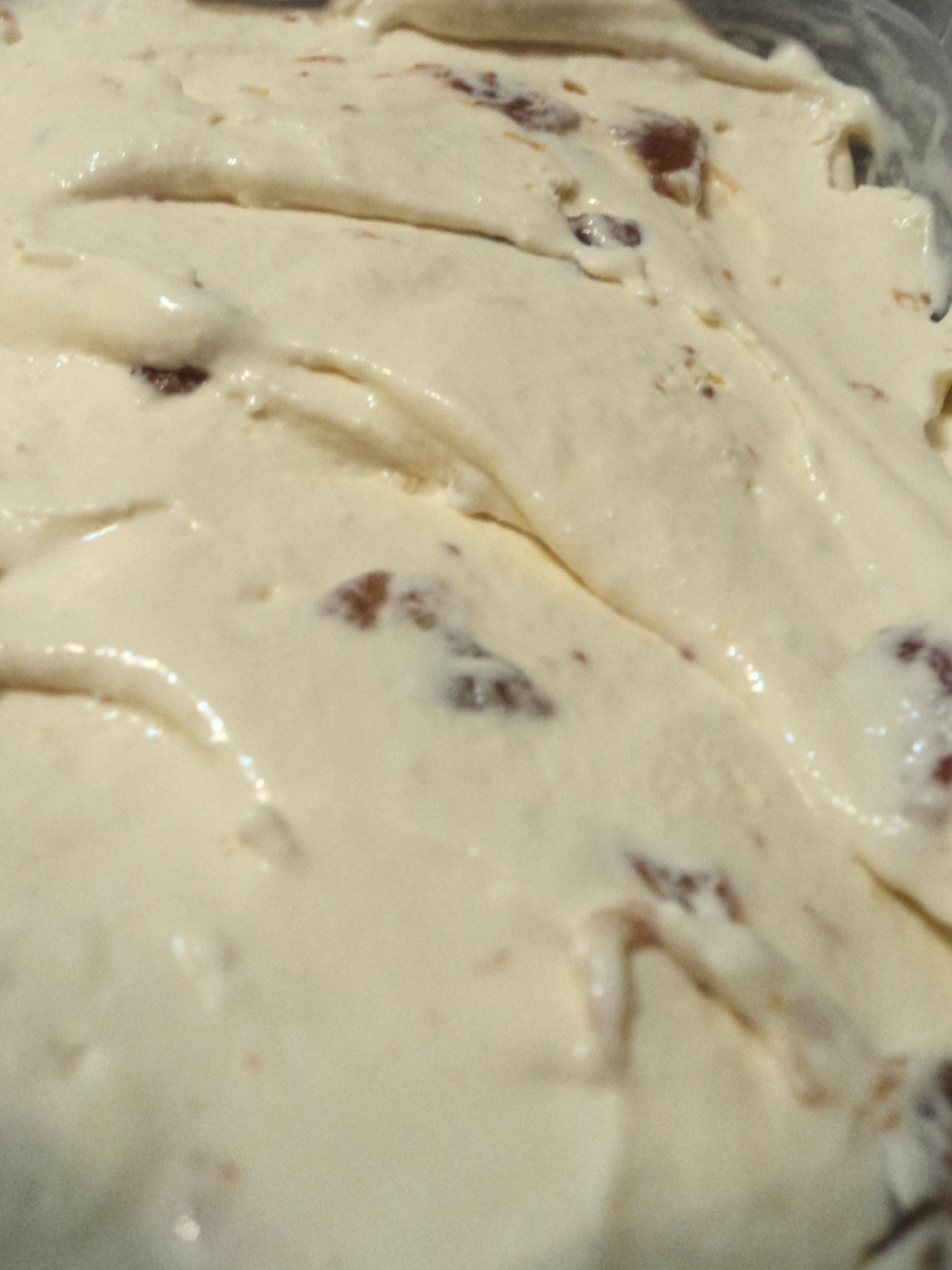 Using a knife, ripple the ice cream so that the dried fruit is swirled throughout. You choose if you want it really mixed in or you want large chunks of fruit ripple sitting in the immaculate pale white ice cream.