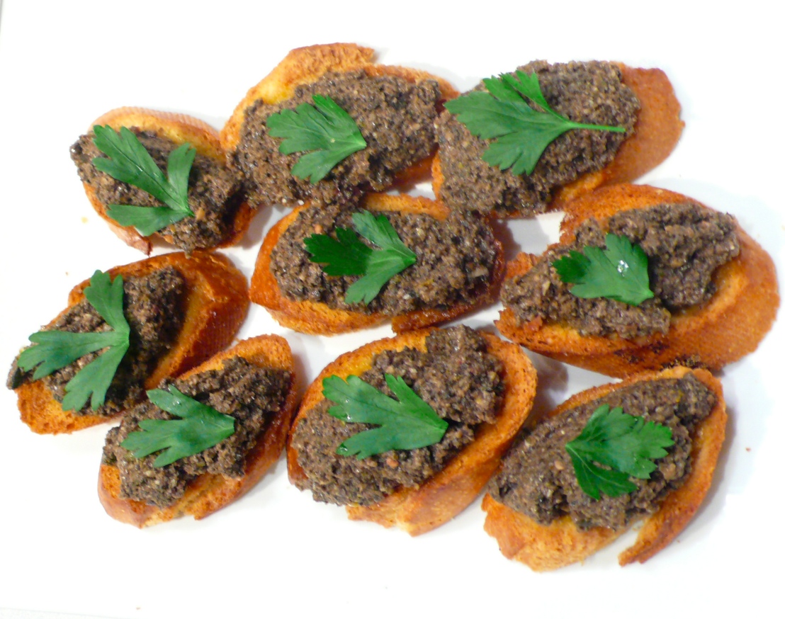 I used a really good quality french bread for the toasts – sliced on the diagonal, and then brushed with a mixture of virgin olive oil, Maldon salt and a few cloves of garlic. Baked in the oven until golden brown, they were then covered with the tapenade, and a small sprig of parsley. Obviously, the parsley isnt neccessary, but it makes it look so pretty and elegant.