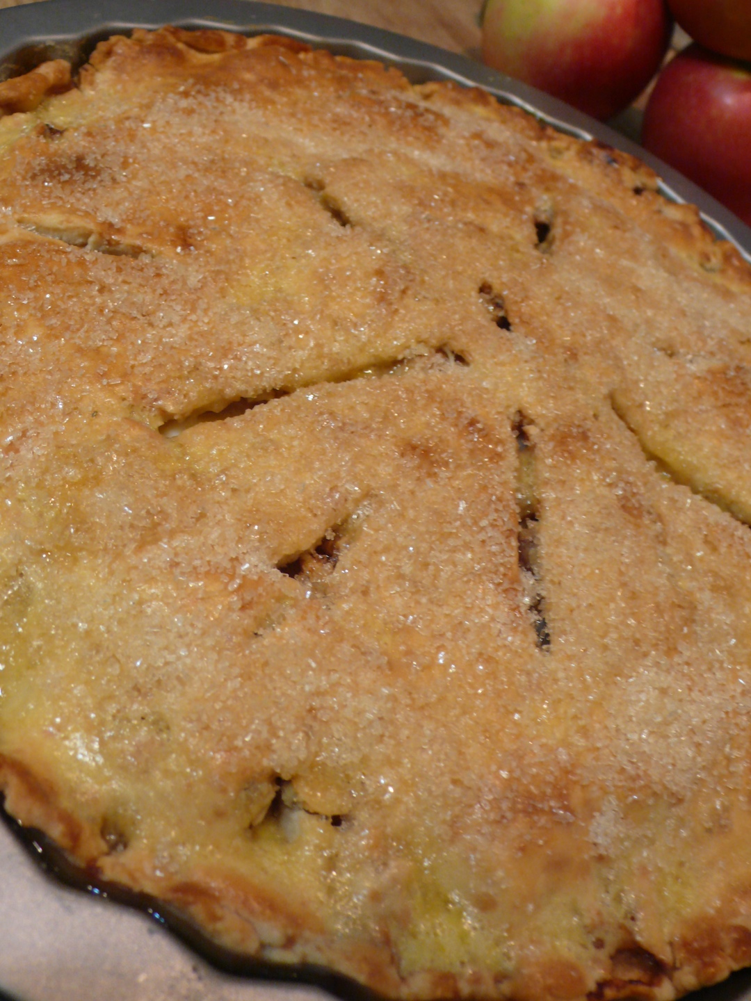 Take the pie out of the oven, and brush all over with the remainder of the beaten egg, and sprinkle with sugar. Return to the oven for 5 – 10 minutes more or until the pie is shiny, and sugar has caramelised a bit.