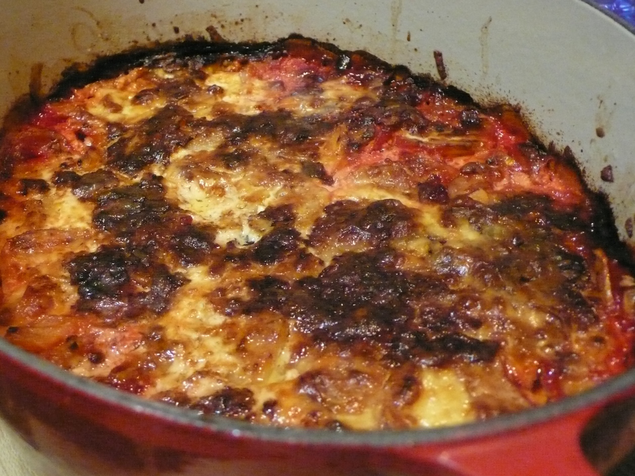 Pour in about 2 cups milk/cream mixture until 2/3rd of the way up to the top layer of cheese. It will vary depending on your dish. Push everything down a bit into the cream. Bake in the oven for at least an 1 hour, possibly up to 2, checking every now and then that you dont need extra milk/cream (you really shouldnt, but add more if you think it needs it). Check to see if the gratin is done by forking a bit of potato – it should be tender, and break under very little pressure.