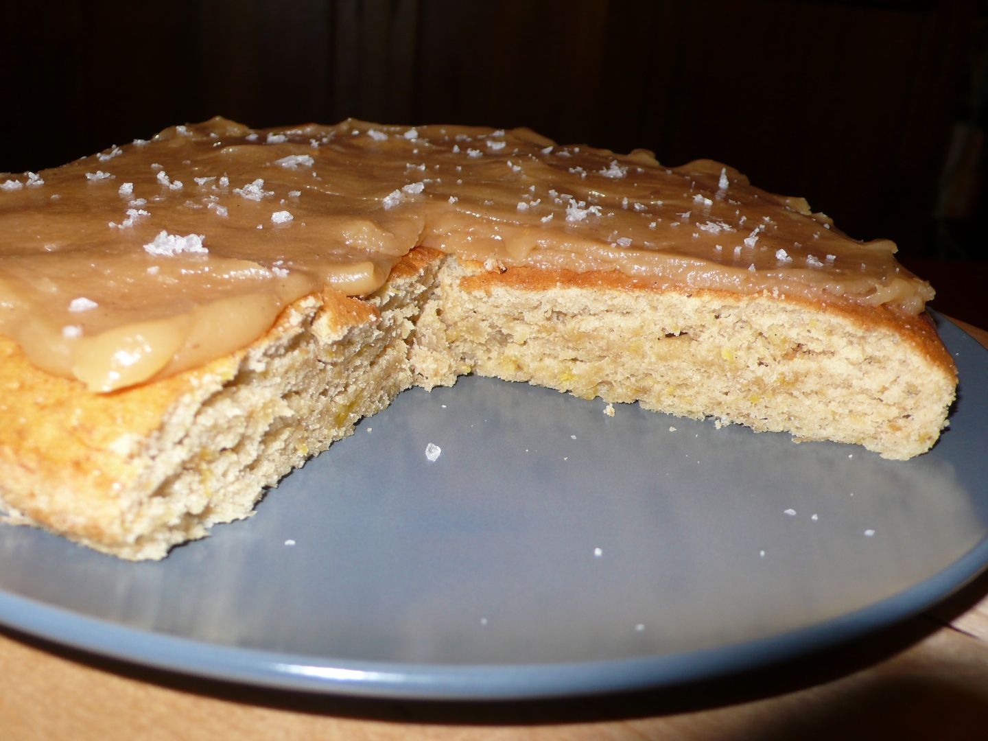 This cake is soooooooo good! Its got such a beautiful banana taste, light, fluffy, perfect crust. It does not bake up high, so if you are going to stuff it with salted caramel, make sure you make two layers. You wont be able to slice in half lengthwise because of the tenderness of this cake, and the gentleness of the crumb, so dont try!